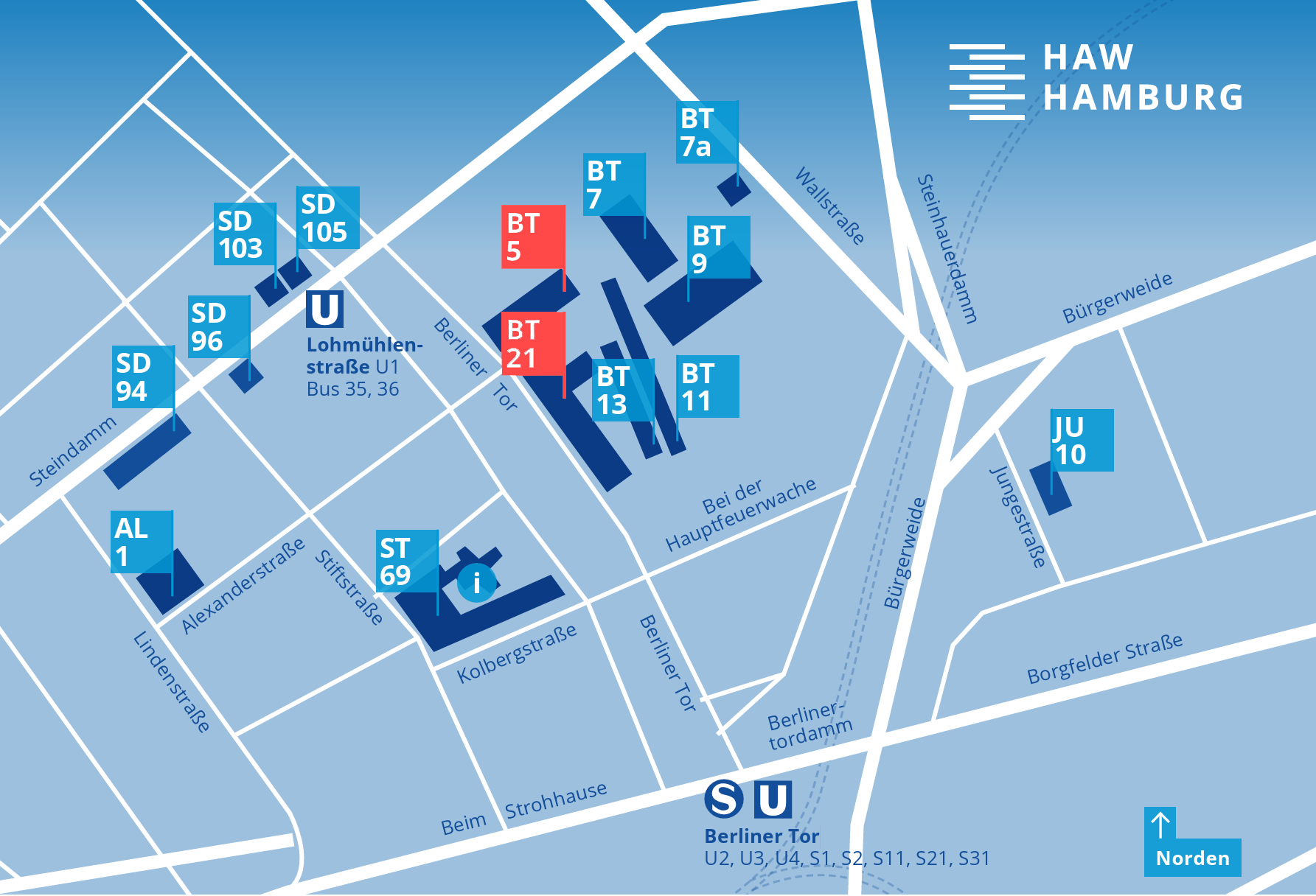 - Die HAW-Gebäude Berliner Tor 5 und Berliner Tor 21 liegen nur wenige Gehminuten vom Bahnhof entfernt.